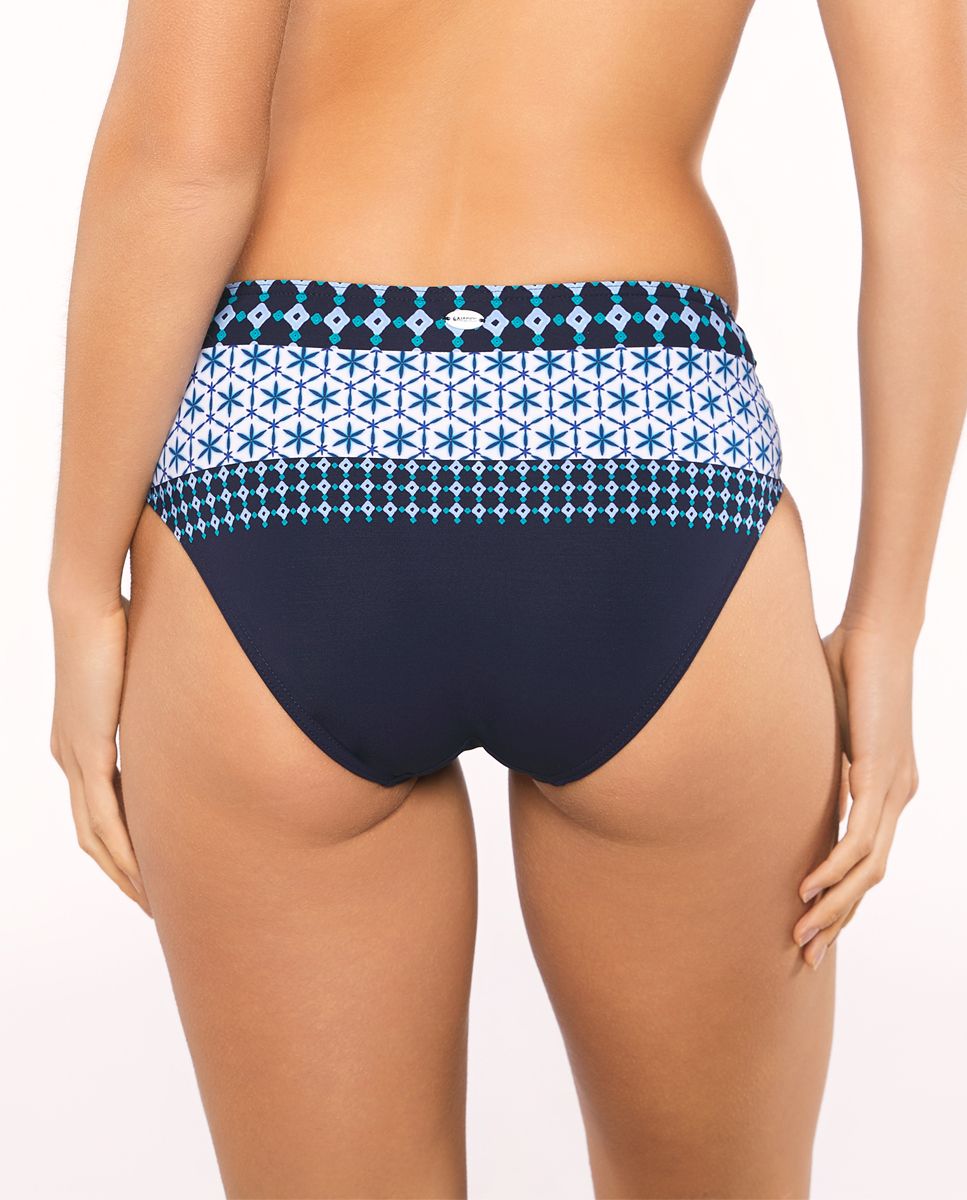 La braguita de este bikini es genial, si lo que buscas es disimular la barriguita esta es la braguita perfecta, ya que lleva unas tiras laterales que permiten regular la altura y así podrás usarla a la medida que tu quieras. Tiene una cobertura completa por lo que cubre bastante bien el culete. Su estampado posicionado con motivos geométricos en tonos azules favorece a todo tipo de pieles. Puedes combinar tu talla según tus necesidades.